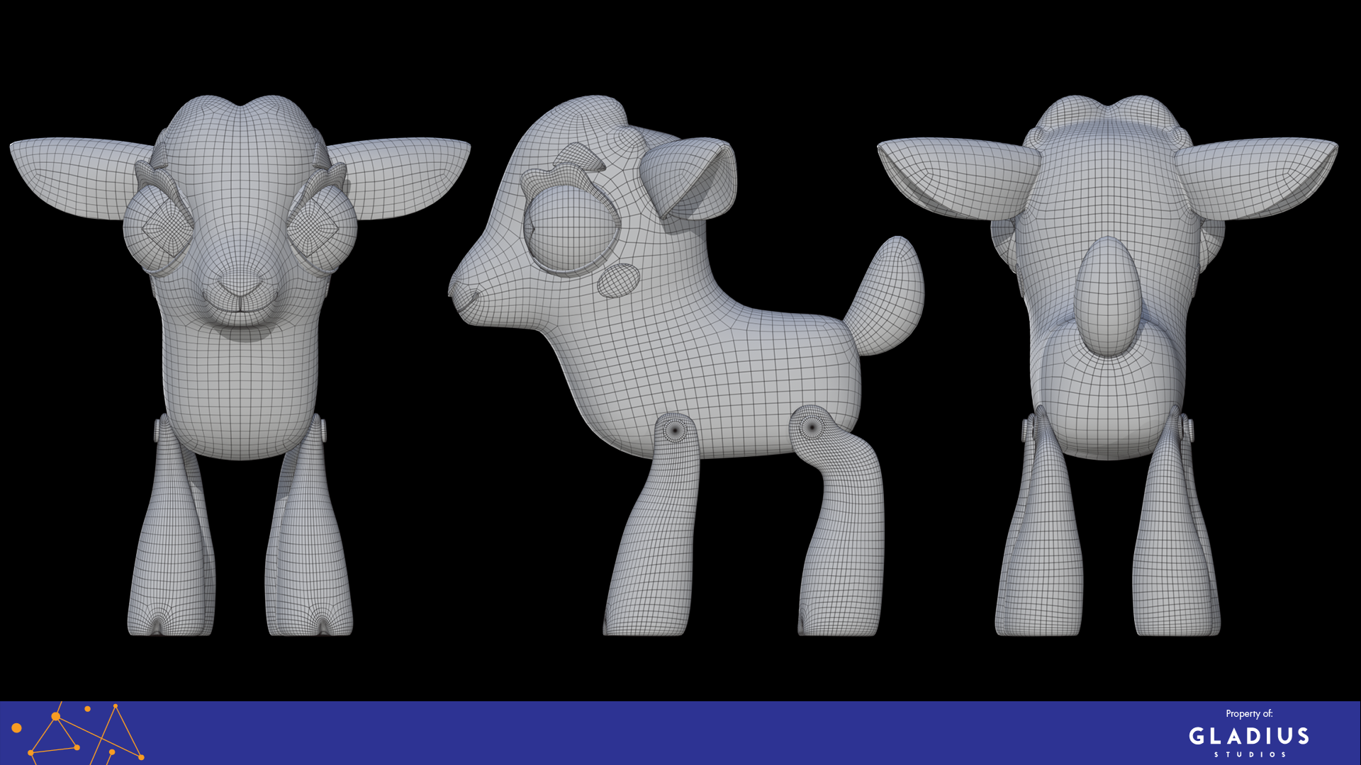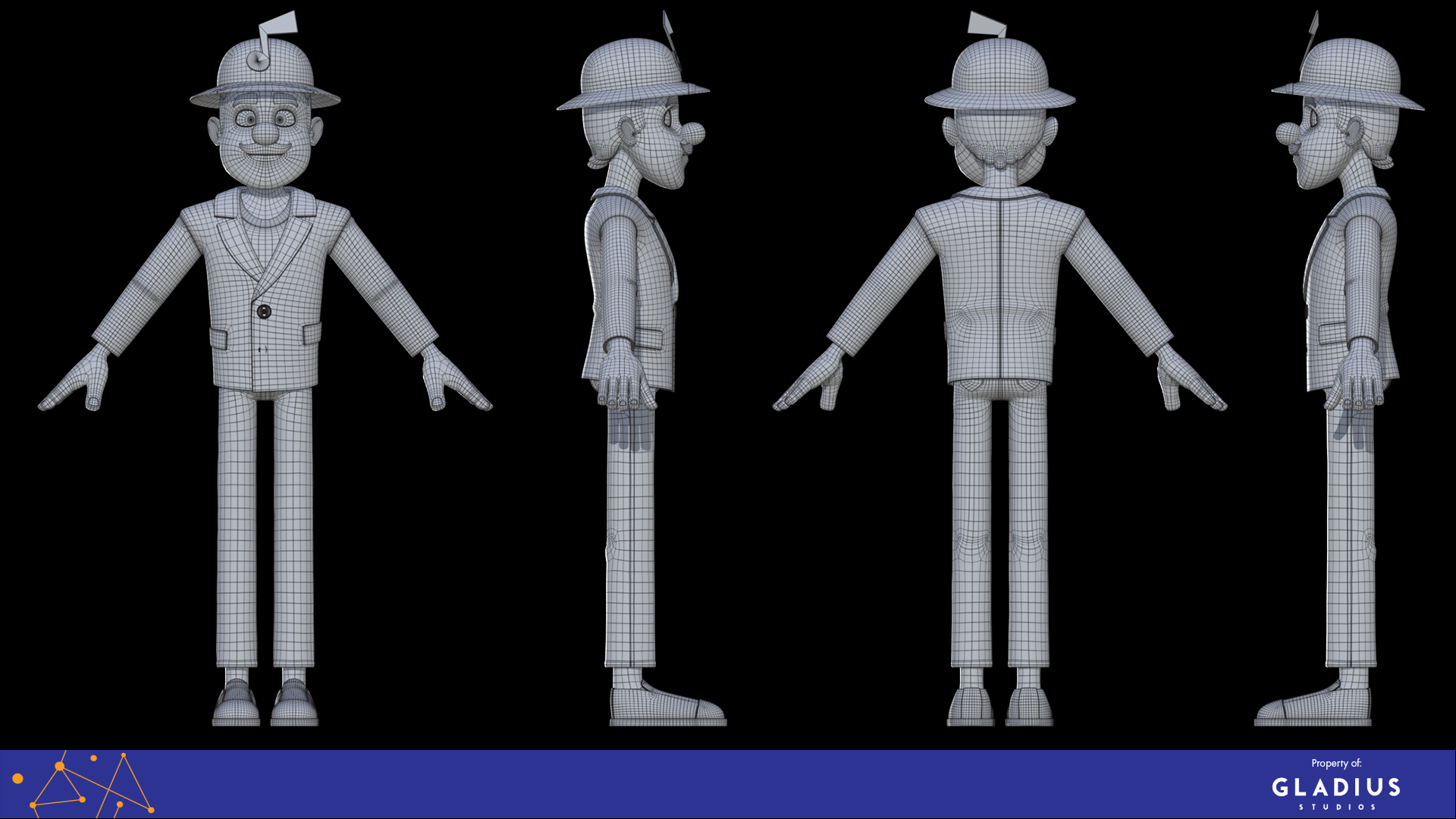 Textured character turntables have been rendered inside UE5, and topology wireframe in Marmoset Toolbag.